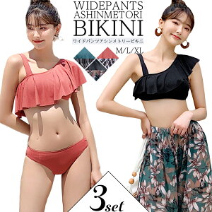3点セット ビキニ 水着 レディース ロングパンツ付き 体型カバー 大きいサイズ ロング丈 アシンメトリー フリル 韓国 韓国ファッション プチプラ セパレート プール 海 ビーチ リゾート 露出控えめ 女性 ママ水着 20代 30代 40代 黒 ブラック 無地 緑 送料無料