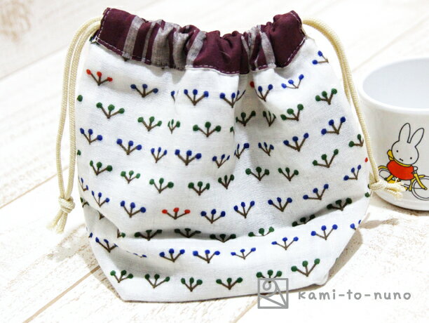 ●柄 表:赤青緑三色の木の実 内側:ボルドー色のチェック ●素材 綿100% ●作品サイズ <巾着大(お弁当袋)> 縦16cm、横15cm、マチ10cm <巾着小(コップ袋)> 縦16cm、横11cm、マチ8cm *この商品の型紙も販売しています。